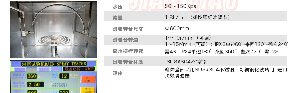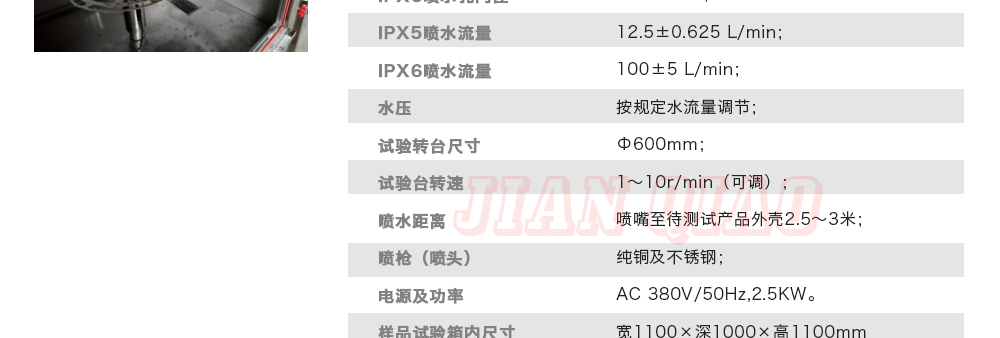 產(chǎn)品型號:IPX-1234 品牌:劍 喬 用途:可程式淋雨試驗箱適用于電工電子產(chǎn)品(包括組件)、燈具照明產(chǎn)品、汽車摩托車零部件外殼和密封件等產(chǎn)品做外殼防護(hù)等級測試(IP 防水等級試驗),模擬其產(chǎn)品在運輸和使用期間可能受咨詢熱線:13829135130