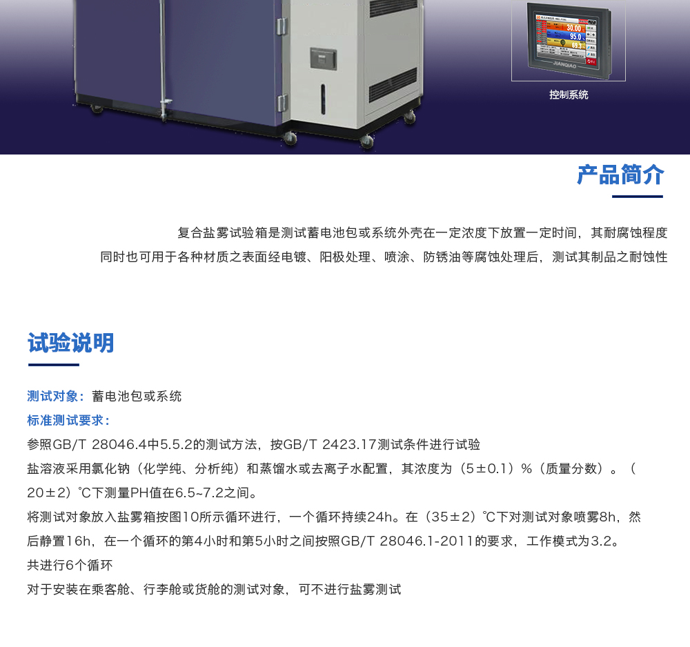 產(chǎn)品型號:JQ-8209-12m3 品牌:劍 喬 用途:復(fù)合鹽霧試驗(yàn)箱是測試蓄電池包或系統(tǒng)外殼在一定濃度下放置一定時間,其耐腐蝕程度同時也可用于各種材質(zhì)之表面經(jīng)電鍍、陽極處理、噴涂、防銹油等腐蝕處理后,測試其制品之耐蝕咨詢熱線:13829135130